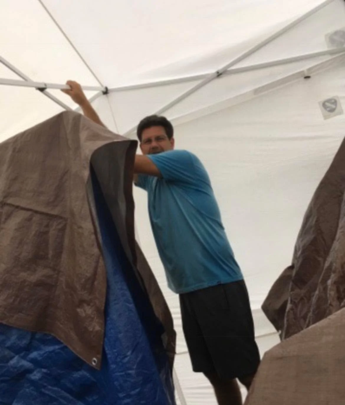 That’s Bill holding our canopy down, trying to keep the entire display from blowing away in the hurricane-like winds. We covered everything inside the booth with plastic to protect it from the rain pouring through the roof.